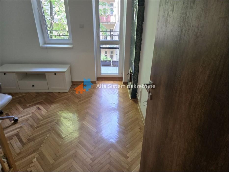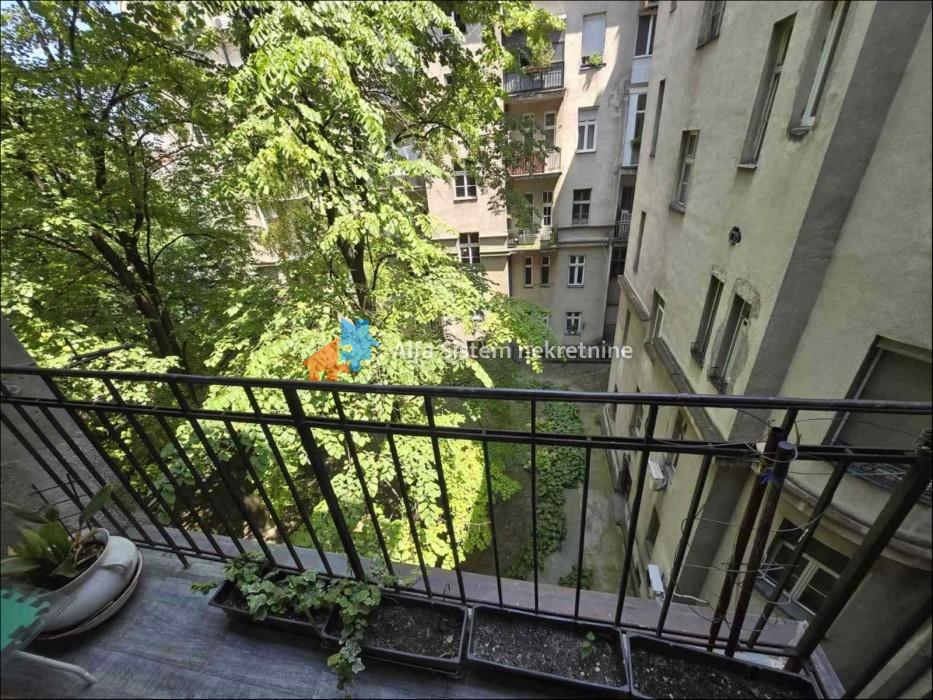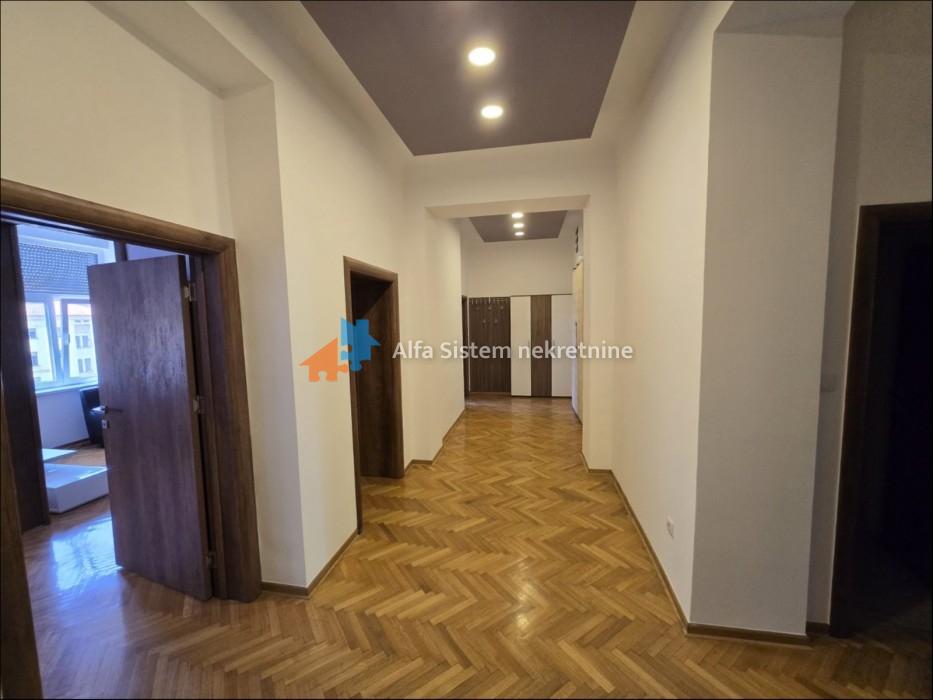 Izdaje se svetao i veoma prostran salonski stan površine 100m² , koji se nalazi u strogom centru grada, na trećem spratu dobro očuvane zgrade predratne gradnje. Zgrada poseduje uredno dvorište, a stan je orijentisan ka jugu, sa pogledom na dvorište punog zelenila, što obezbeđuje mir i prijatnu atmosferu u samom centru grada.
